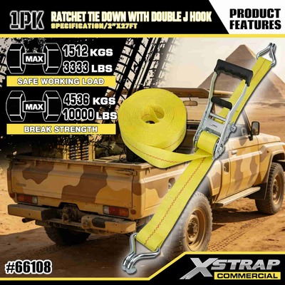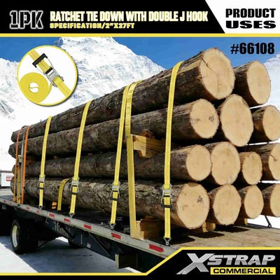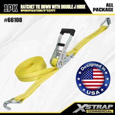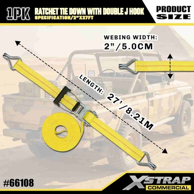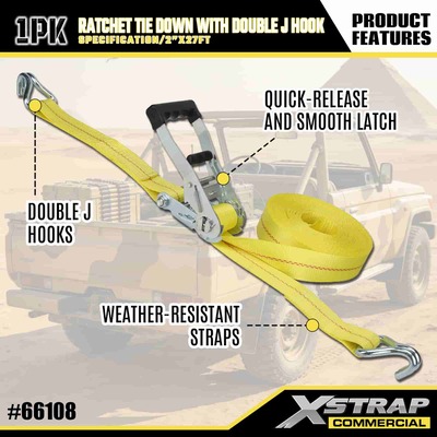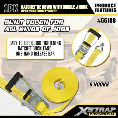 Xstrap Ratchet Uväzovací s dvojitými J háčikmi, 2” x 27 polyesterový upínací popruh Vyťahovací račňový popruh, kapacita 3333 libier zaisťovacie popruhy na uchytenie nákladu s dvojitými J háčikmi pre nákladné auto pickup, SUV, motocykel s horným nosičom.