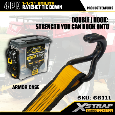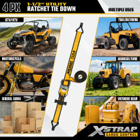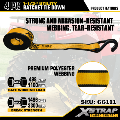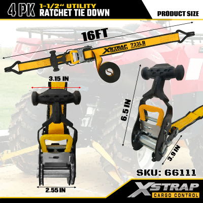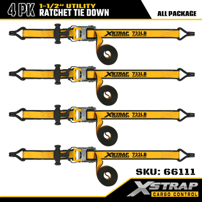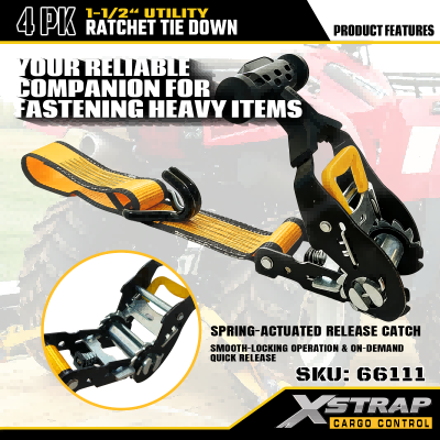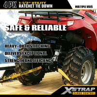 Xstrap 4 Pack T Rukoväť Ráčna Uväzovanie, 1-1/2” x 16' Polyesterový popruh s račňou, popruhy na upevnenie nákladu s kapacitou 1100 libier s dvojitými J háčikmi pre pickup s ovládaním nákladu, SUV, motocykel s hornými stojanmi.