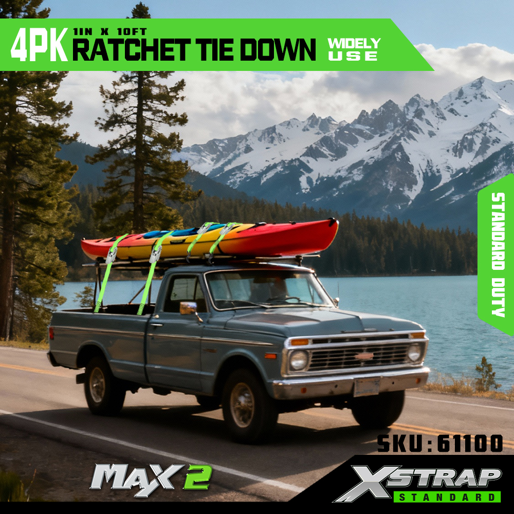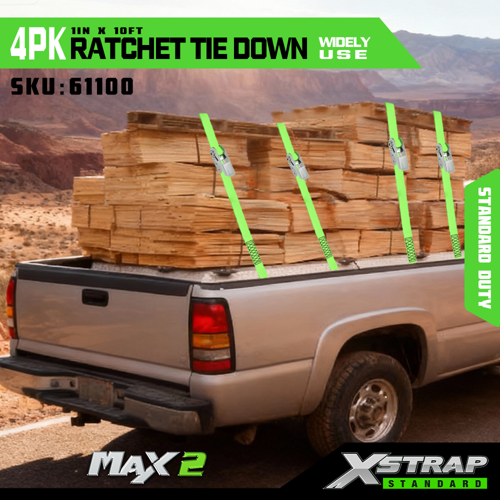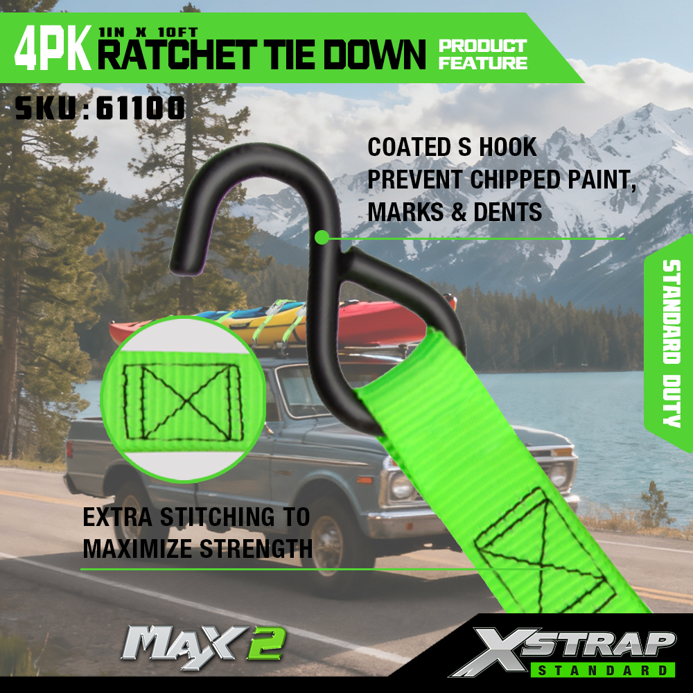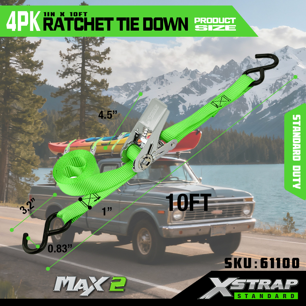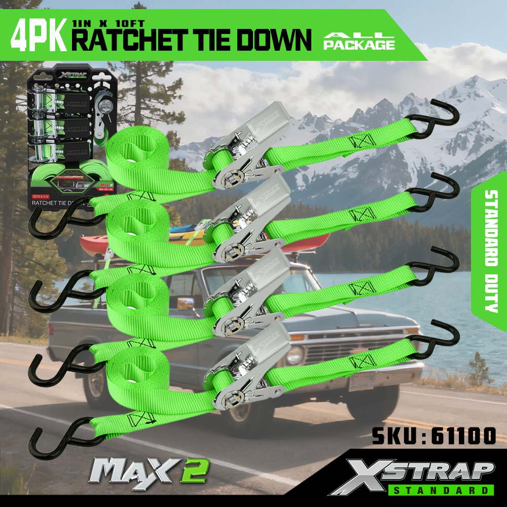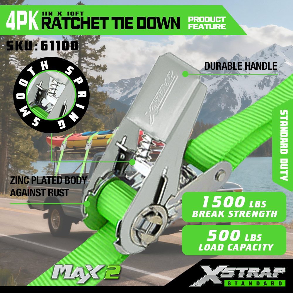 Xstrap 4 Pack Ratchet Tie Down, 1” x 15' polyesterový popruh s upínacím popruhom s račňou, 500 lbs kapacitné popruhy na upevnenie nákladu s hákmi pre pickup, ľahký prívesný motocykel, ľahký rybársky čln, vodný skúter, snežný skúter.