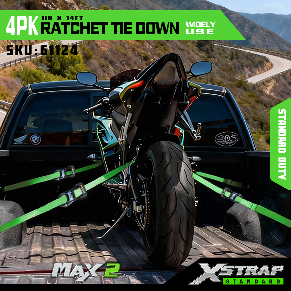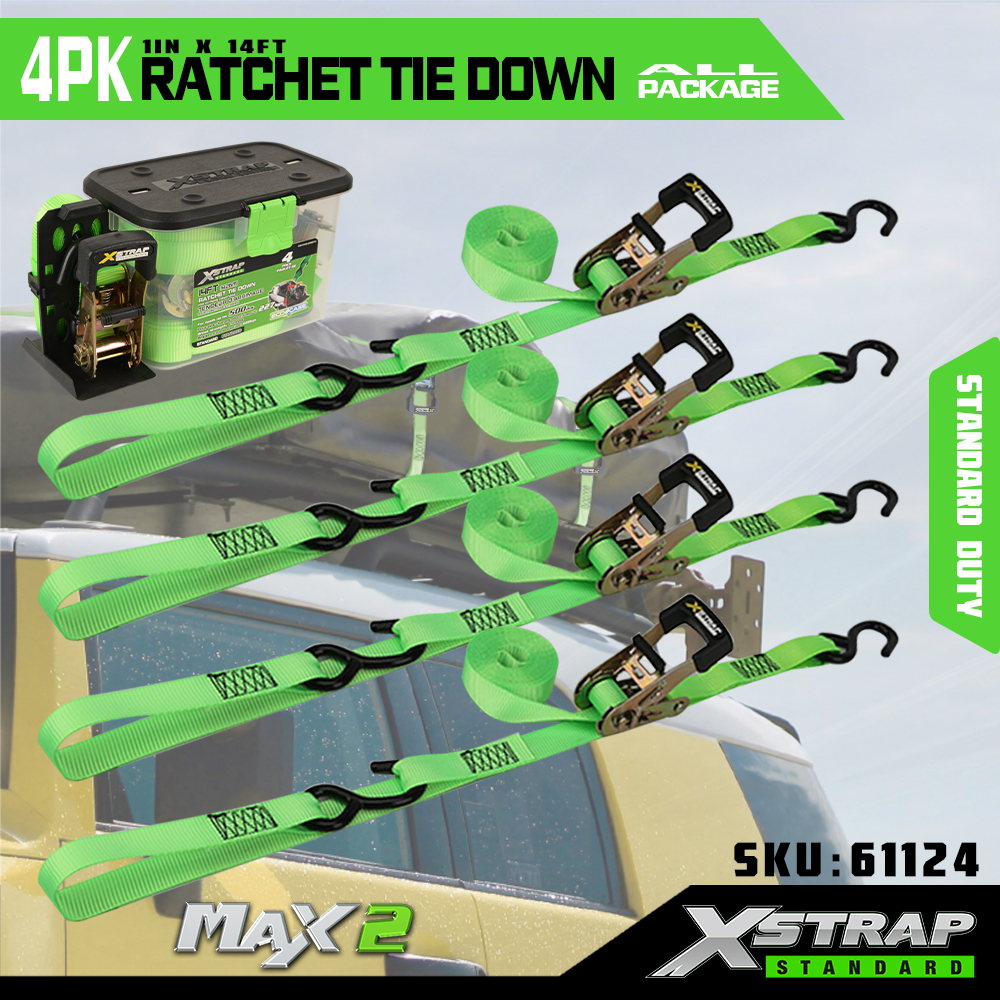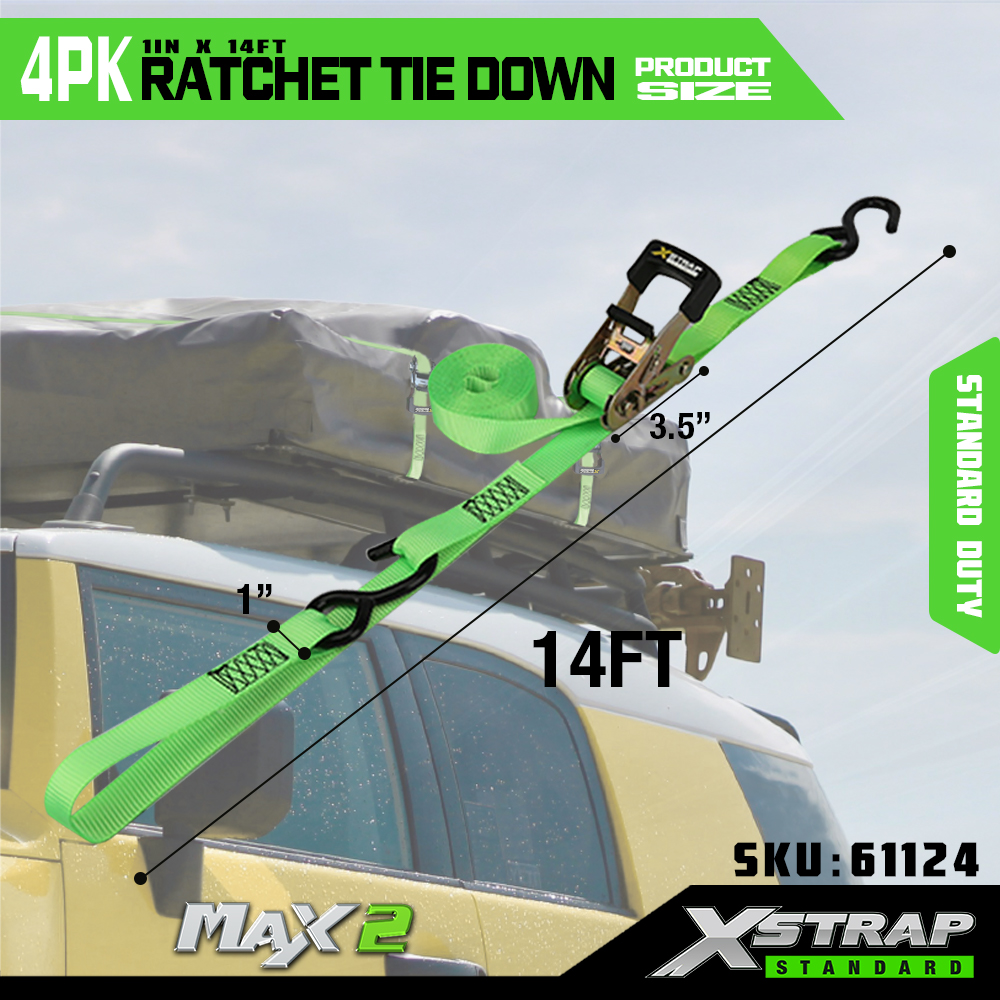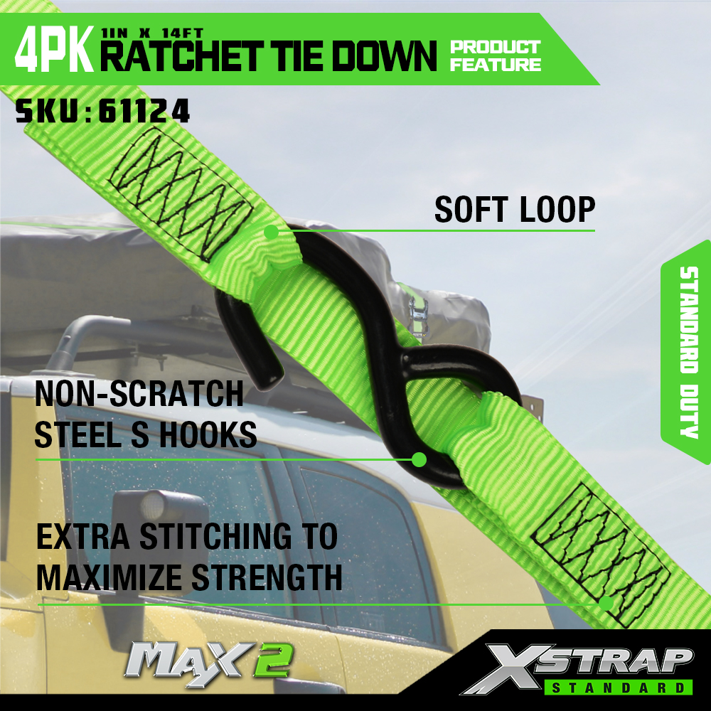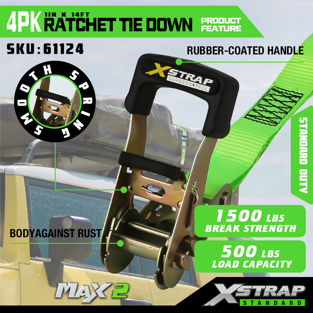 Xstrap 4 sady popruhov s upínacou západkou, 1" x 14" polyesterový popruh s račňou s mäkkou slučkou, 1500 libier (500 libier) popruhy na upevnenie nákladu s kovovou račňou a S háčikmi pre náklad, nákladné auto, kosačku, štvorkolky.