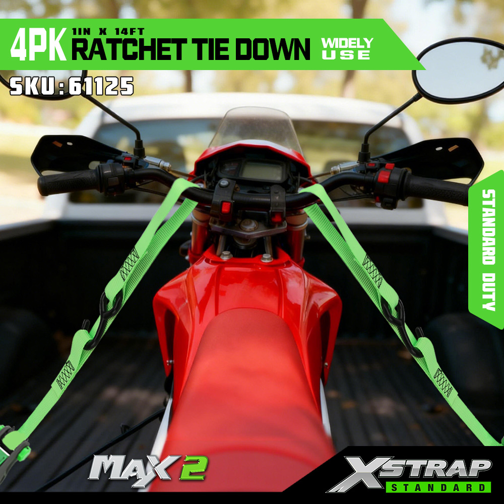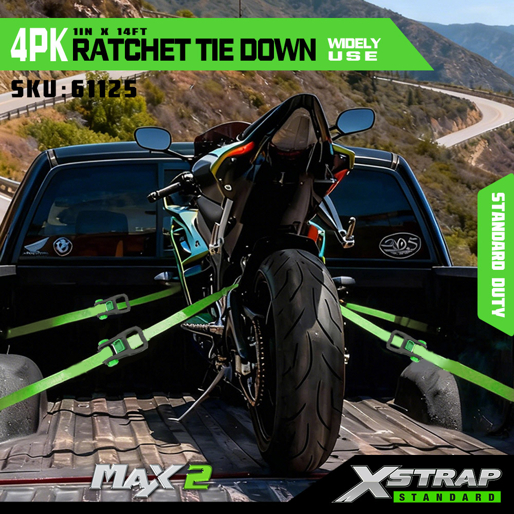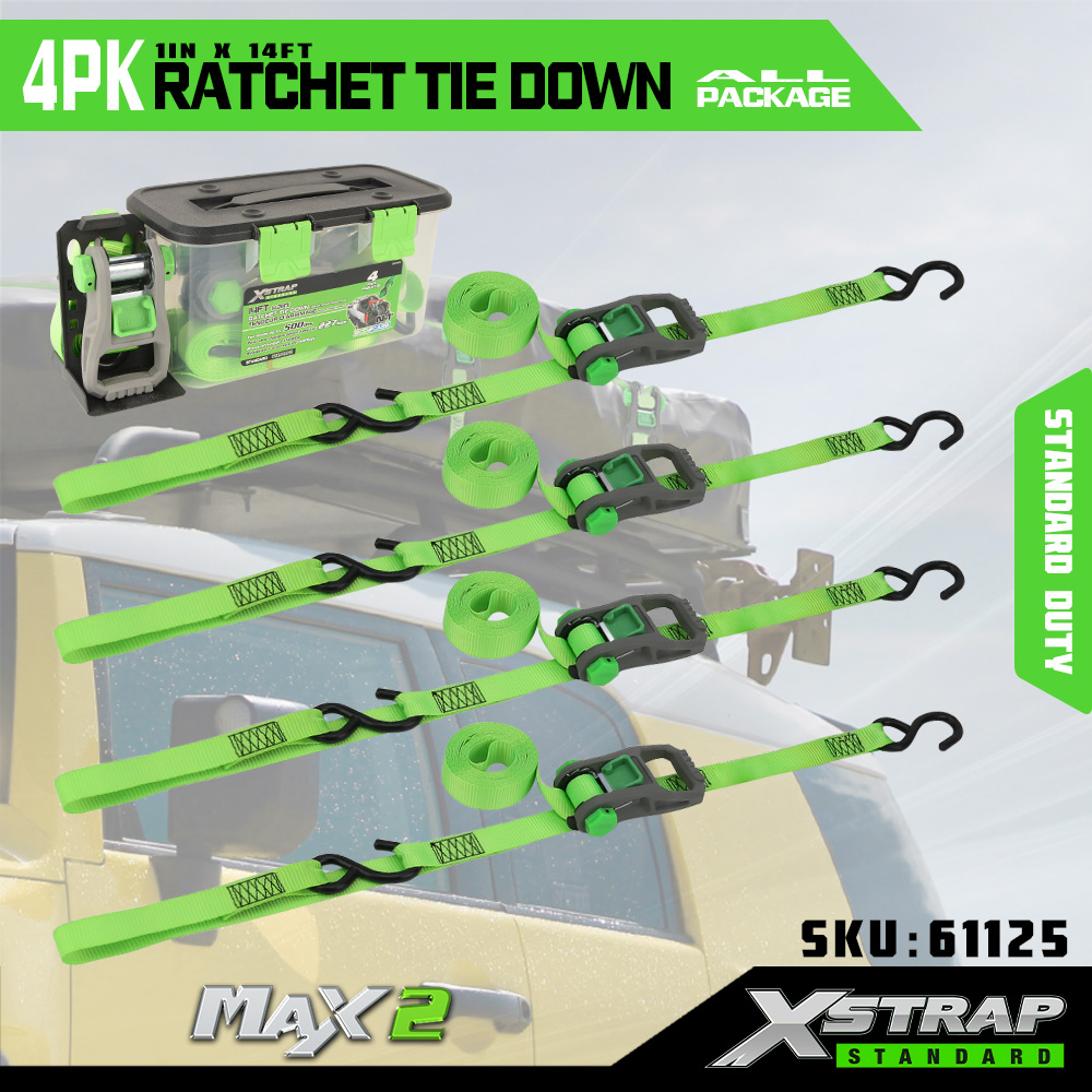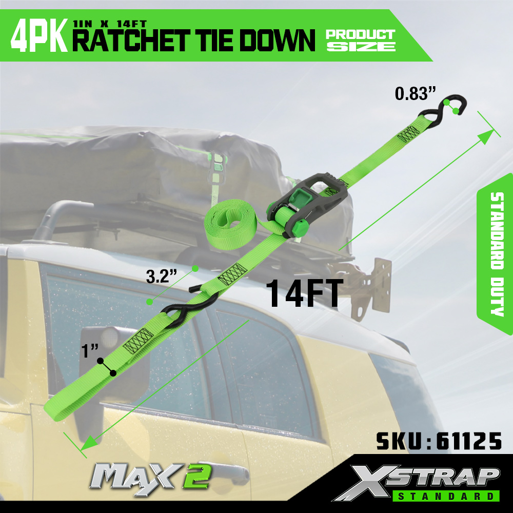 Xstrap 4 Pack Ratchet Tie Down, 1” x 14” polyesterový upínací popruh s mäkkou slučkou Sťahovací račňový popruh s kapacitou 500 libier s háčikmi v tvare S pre pick-up, SUV, nosiče do auta, motocykle, ľahké rybárske člny, vodné skútre, snežné skútre.