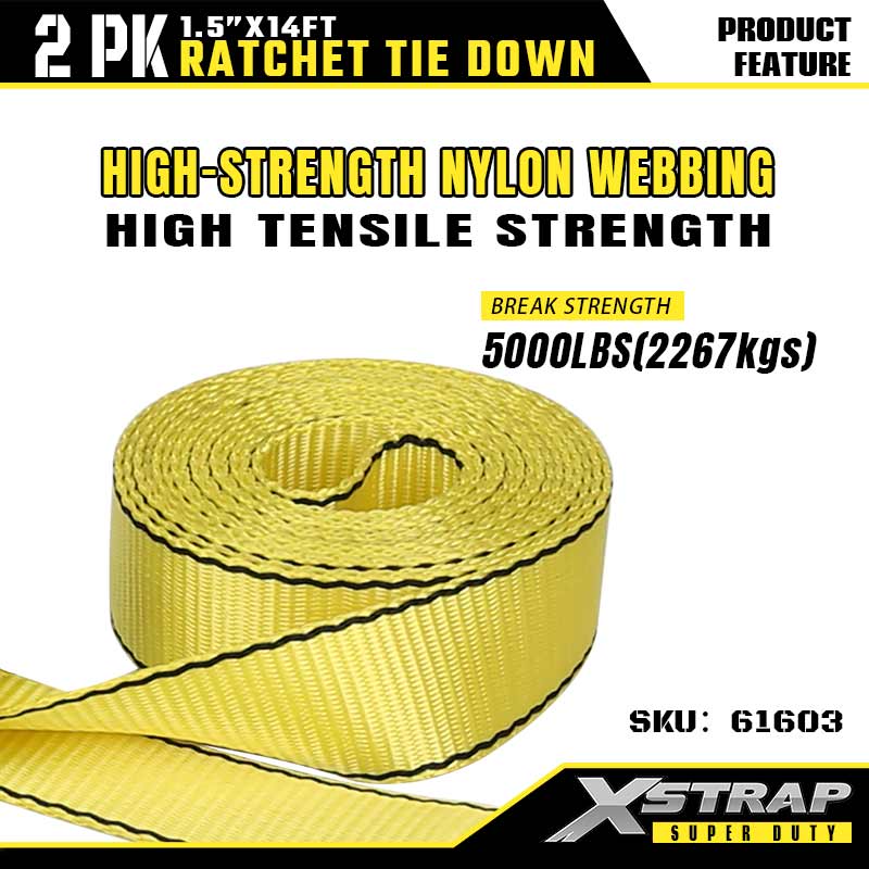 - Nylonové popruhy s vysokou pevnosťou v ťahu (pevnosť v pretrhnutí 5 000 LBS): Skonštruované s vysokopevnostnými žltými nylonovými popruhmi (šírka 1,5") — poskytuje výnimočnú pevnosť v ťahu (brzdné zaťaženie 5 000 LBS) a odolnosť proti oderu, ideálne pre ťažkú prepravu alebo priemyselné upevňovacie úlohy.l