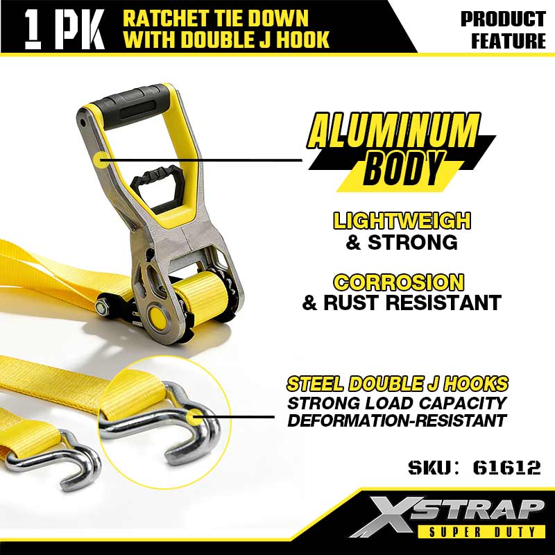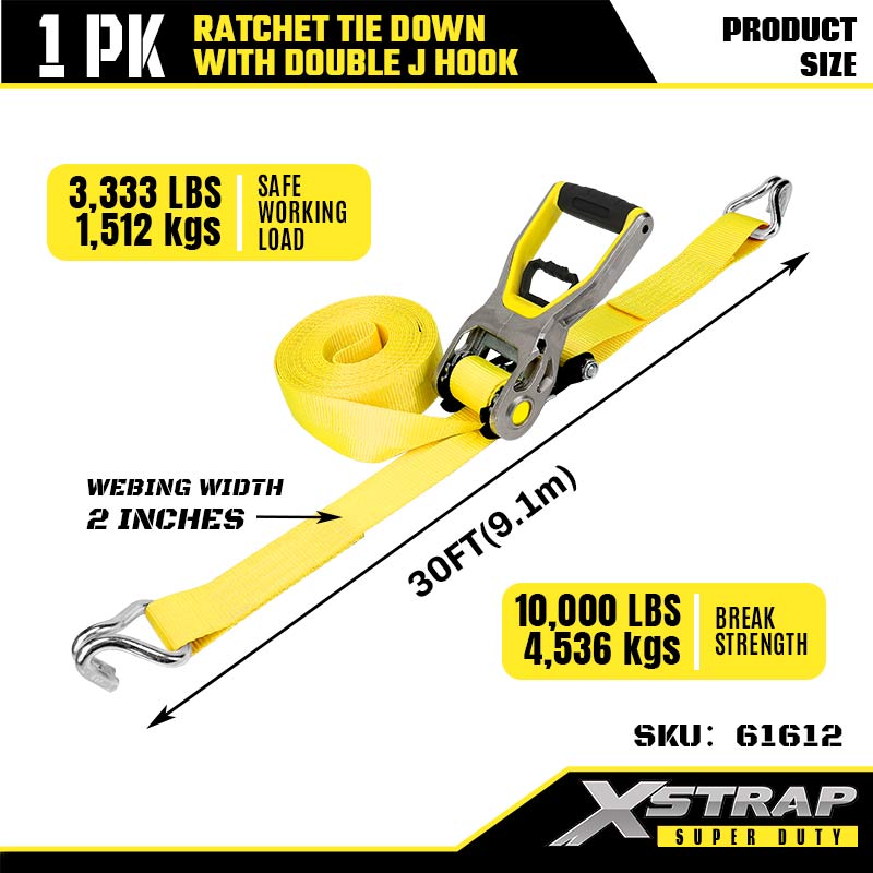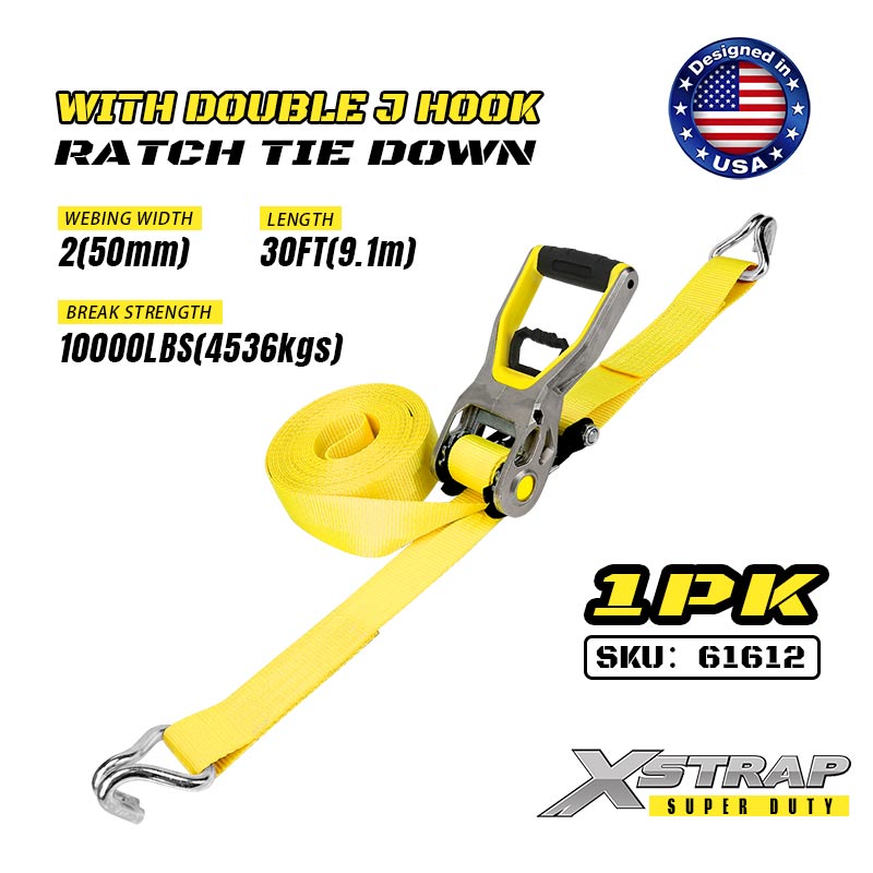 Uväzovacie popruhy Xstrap 2PK s dvojitými J háčikmi, 2” x 30“ polyesterový upínací popruh s račňou, 3333 lbs kapacitné popruhy na upevnenie nákladu s dvojitými J háčikmi pre ťažký príves, lyžiarsky čln s plochým lôžkom, malé auto, ťažké vybavenie.